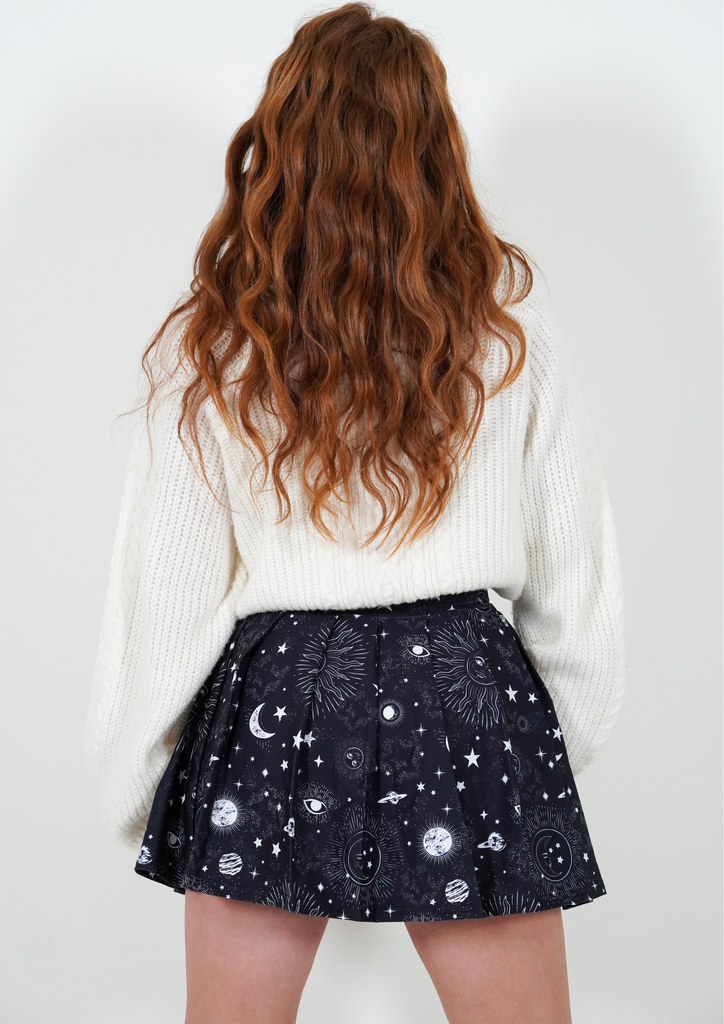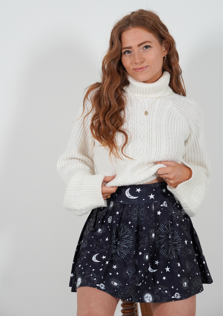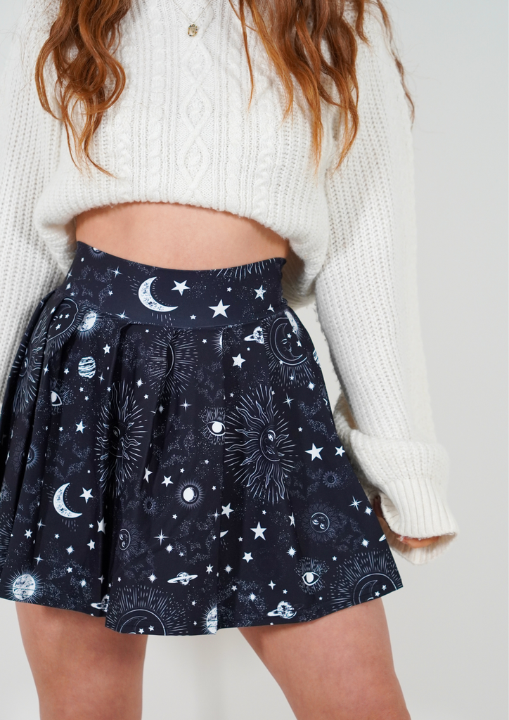 Crafted from a silky, breathable fabric, its pleated design drapes beautifully, adding a celestial elegance to your every move. The midnight blue hue, with subtle shimmering undertones, mirrors the night sky, making it a striking addition to your fitness wardrobe.
