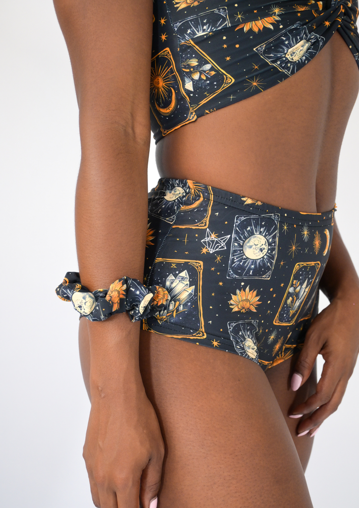 The enchanting celestial print features golden moons, tarot cards, crystals, lotus flowers, and shimmering stars on a deep navy backdrop - bringing cosmic energy to every pole session.