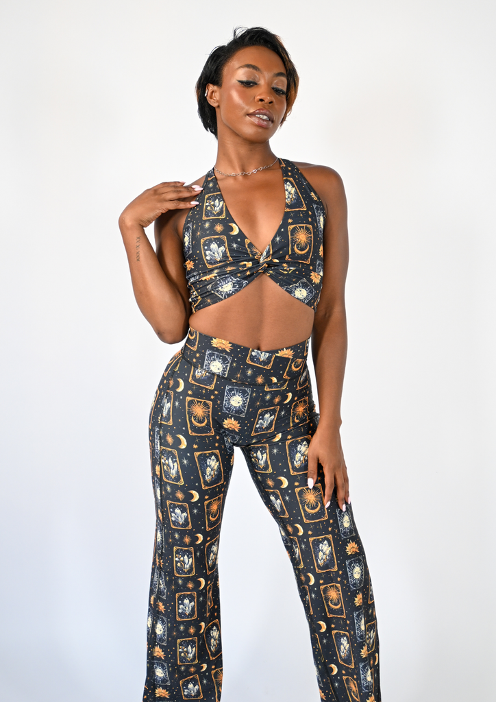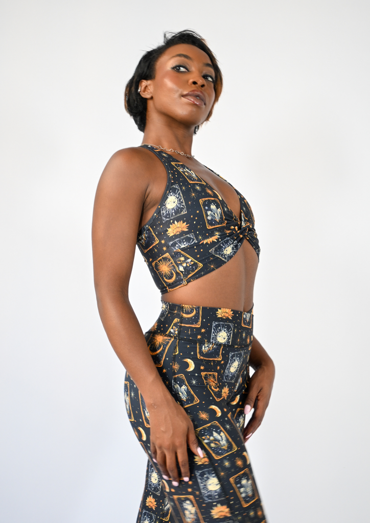 The cosmic-inspired print blends golden moons, tarot cards, crystals, lotus flowers, and stars against a deep navy backdrop, bringing mystical energy to every move. Crafted from soft, sweat-wicking, and supportive fabric, it’s ideal for the gym, yoga, pole, or styling with every day pieces to elevate your wardrobe.