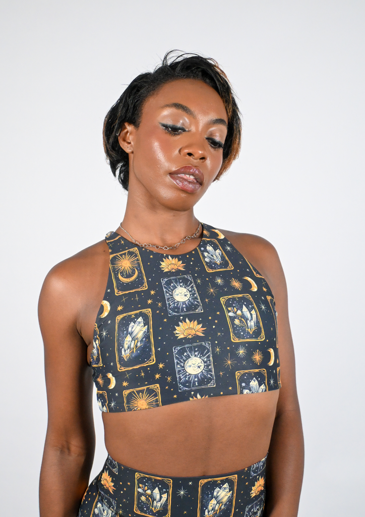 The cosmic-inspired print blends golden moons, tarot cards, crystals, lotus flowers, and stars against a deep navy backdrop, bringing mystical energy to every move. Crafted from soft, sweat-wicking, and supportive fabric, it’s ideal for the gym, yoga, pole, or styling with every day pieces to elevate your wardrobe.