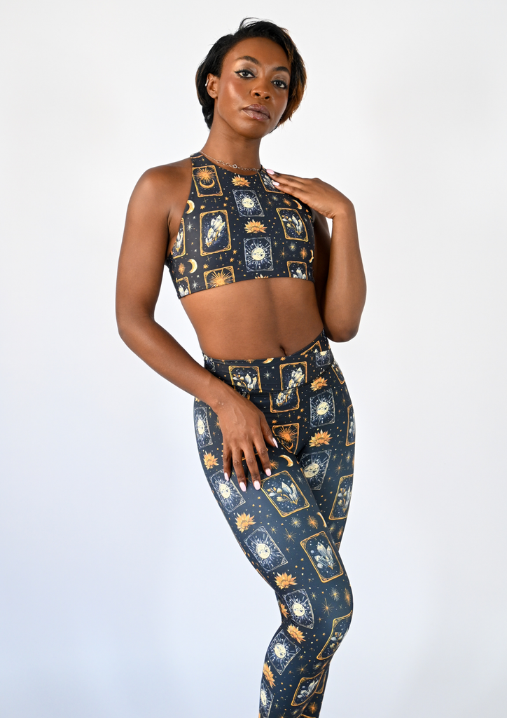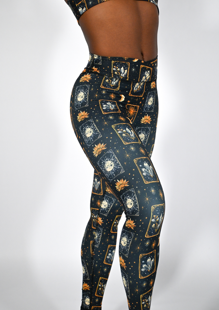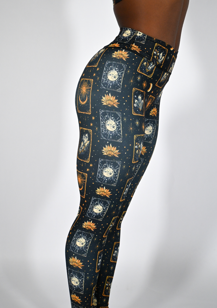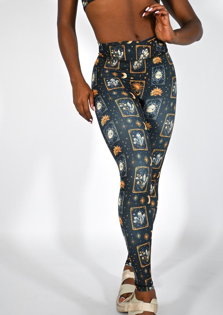 Featuring a flattering wrap waistband that enhances your curves and our signature V-back seam to accentuate the booty, these leggings are designed to sculpt and support in all the right places. The mystical print showcases golden moons, tarot cards, crystals, lotus flowers, and stars set against a deep navy backdrop - perfect for those who love to stand out. Made from soft, stretchy, squat-proof fabric, they move with you whether you’re in the studio, at a festival, or styling them for streetwear.