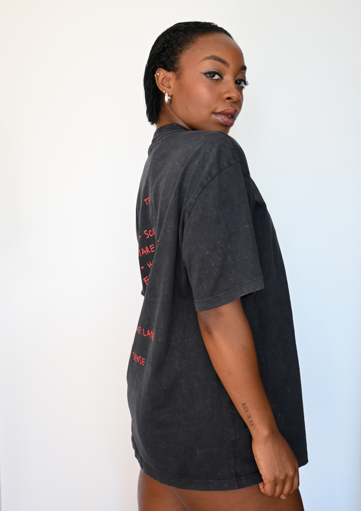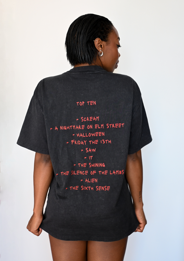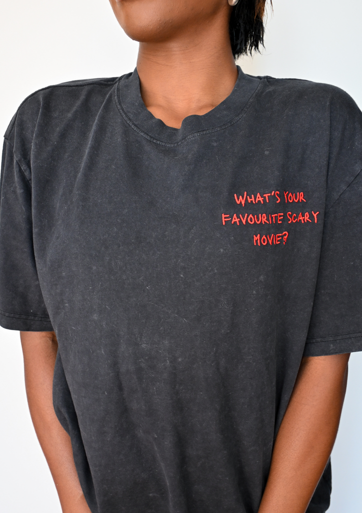Turn up the chills with our oversized Scary Movie Tee - the ultimate nod to cult horror and 90s nostalgia. Crafted from ultra-soft fabric in an acid wash black finish, this tee brings killer comfort with a statement edge.