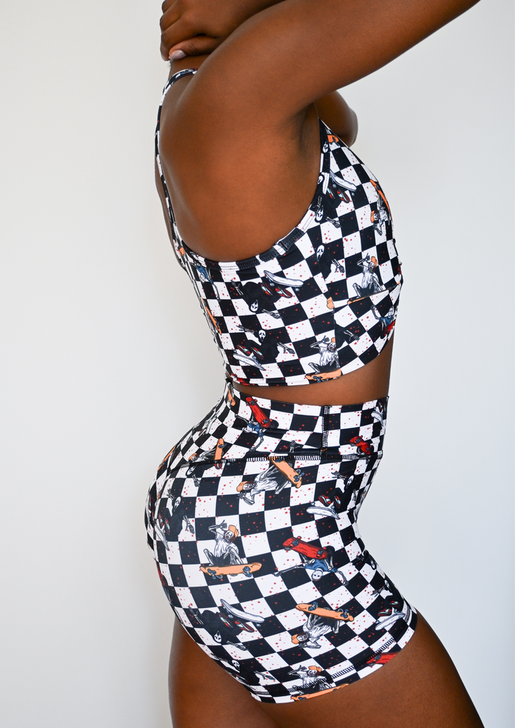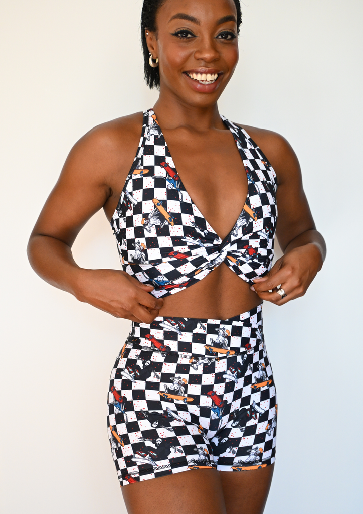Fierce, fearless, and a little bit freaky - the Thrash & Slash Crossover Sports Bra brings the perfect mix of support and style. The crossover front flatters your shape while the skater-horror print gives full slasher energy, featuring Ghostface, Pennywise, and Michael Myers skeletons riding through carnage. A total statement piece for every unapologetic Vixn.