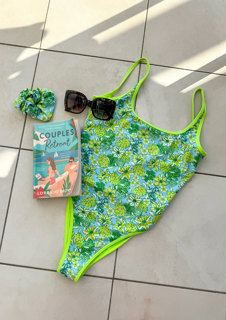 Complete your beach look with the Turtle Reef Scrunchie - the perfect finishing touch to your statement style.