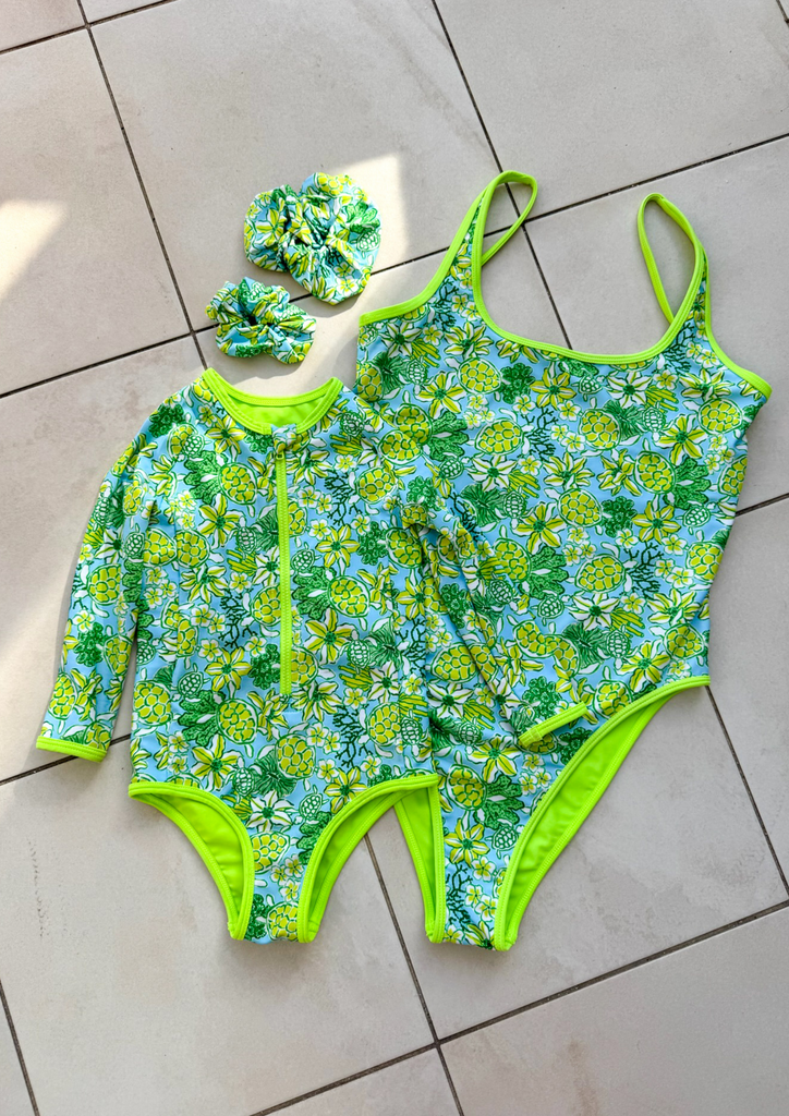 Make a statement this summer in the Turtle Reef Swimsuit, designed to turn heads while offering comfort and confidence. Featuring a chic square neckline, low back, and moderate coverage, this one-piece combines flattering cuts with bold energy.