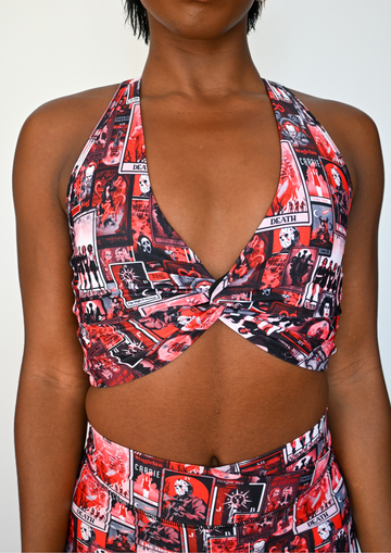Channel your inner final girl in the Killer Deck Crossover Sports Bra - a fierce fusion of style and support. With a sculpting crossover front and racer back, this bra keeps you confident and in control. The Killer Deck print features iconic cult horror films transformed into tarot cards, blending gothic energy with bold, standout style.